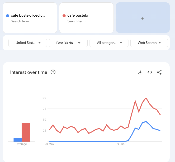The announcement of the Iced drinks was low-profile for such a major brand but I was alerted because the search term ‘Cafe Bustelo Iced Coffee’ has seen a 2000% increase in the past 30 days.