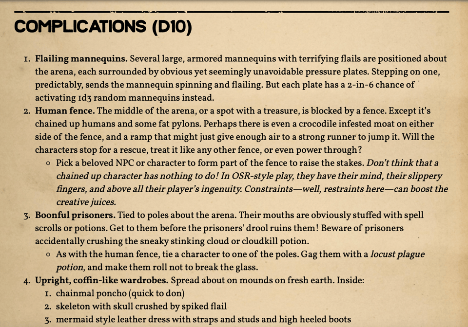 With the tables from this article you can make every arena-style combat a memorable, quirky, and/or very dangerous set piece.