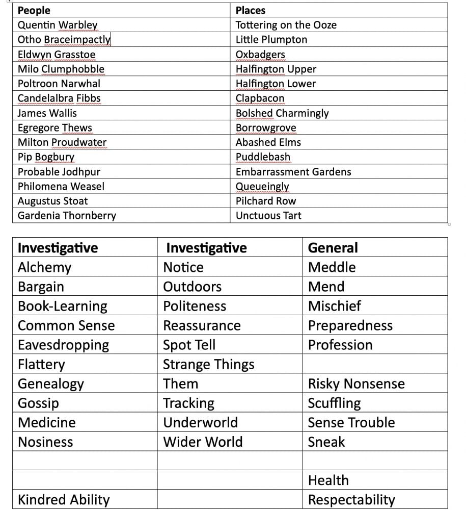 Oh - for the Shires Out game, I prepared a list of sample place names and character names.
