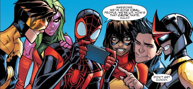 More importantly, as readers age and new readers come aboard, shouldn’t the franchise and characters change to accommodate those new potential readers and the times in which they live? How is a fifteen year old, born in 2008, supposed to relate to Steve Rogers if he’s still being written the same way as he’s been written since 1975, or tackling the same issues? And when a writer takes on a franchised or licensed character like Miles Morales, there’s no way to avoid having their world view affect the way that characters is written. Brian Michael Bendis is a specific person with a specific world view. How can someone possibly expect successive creators who are younger, come from different cultural backgrounds, and have definitely experienced different sorts of lives than Bendis has, to write Miles in exactly the same way Brian did over a DECADE ago in 2011. That’s ludicrous. Times change, the world changes, and with the changing times, comic book creators—whether you like it or not—are grappling with stories about that changing world, as are their readers, some of whom are first arriving—having graduated from middle grade books and graphic novels or coming from superhero movies and television—and many whom are grappling with the same changing world those writers are, as well. If all they get is the same punch-punch-punch Spidey stories, with Peter Parker written exactly as he was in 1963 or even 1986, without any change, emotional growth, political / cultural / societal exploration, then why should fifteen year old readers care? Saying “just write Peter Parker” is insane—what informs Peter Parker? A fictional character doesn’t just write himself, does he? His actions, motivations and conflicts have to be shaped, influenced and crafted by the person telling his story. And if you’re asking a writer to leave out their own influences—write a cookie cutter story based on some emotional, societal, cultural style guide that neglects our changing world and the various factors—including time—which influence the people who live in it, then the end result, my friends, will be dull stories that don’t challenge us as readers and reflect the world in which we live.