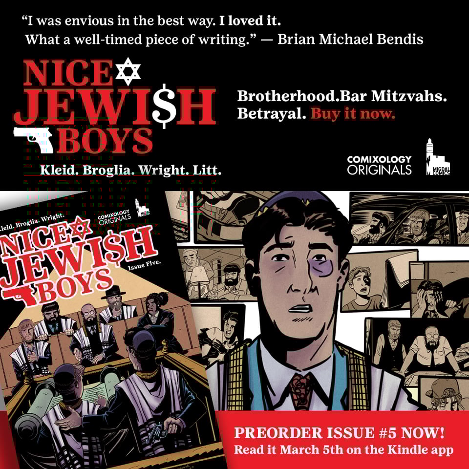 Anyway, Nice Jewish Boys #5. Next week, March 5th, from Comixology Originals. Buy it on Amazon and then read it on your Kindle app. We’ll unpack the series a little more in the next newsletter. You can also get the other issues here.