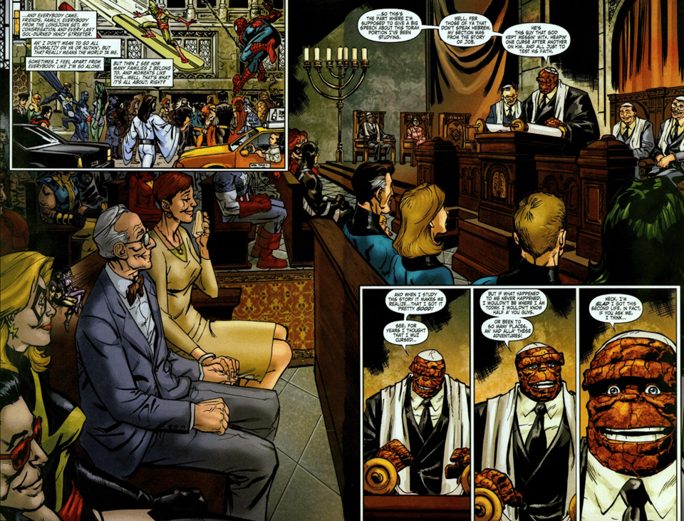 I’m pretty excited to see if folks like the way it all turns out. I’m also happy that this may be the first ever comic book to feature a traditional bar mitzvah speech about the speaker’s actual parsha (Torah portion) — yes, the ever-lovin’ blue-eyed Thing did give a Dan Slott-penned speech at his own sequential bar mitzvah reading from the Book of Job in an issue of Fantastic Four, but selections from the Book of Job aren’t usually read from the Torah at a bar mitzvah (not even as part of a haftorah reading, which are selections from the books of Nevi'im —“Prophets”—publicly read in synagogue as part of Jewish religious practice.) The Thing would probably reference something from his weekly Torah portion for his bar mitzvah, and so I stake my claim that Nice Jewish Boys is the first comic book in history to include an accurate bar mitzvah speech. Clobber that, Benjamin J. Grimm.