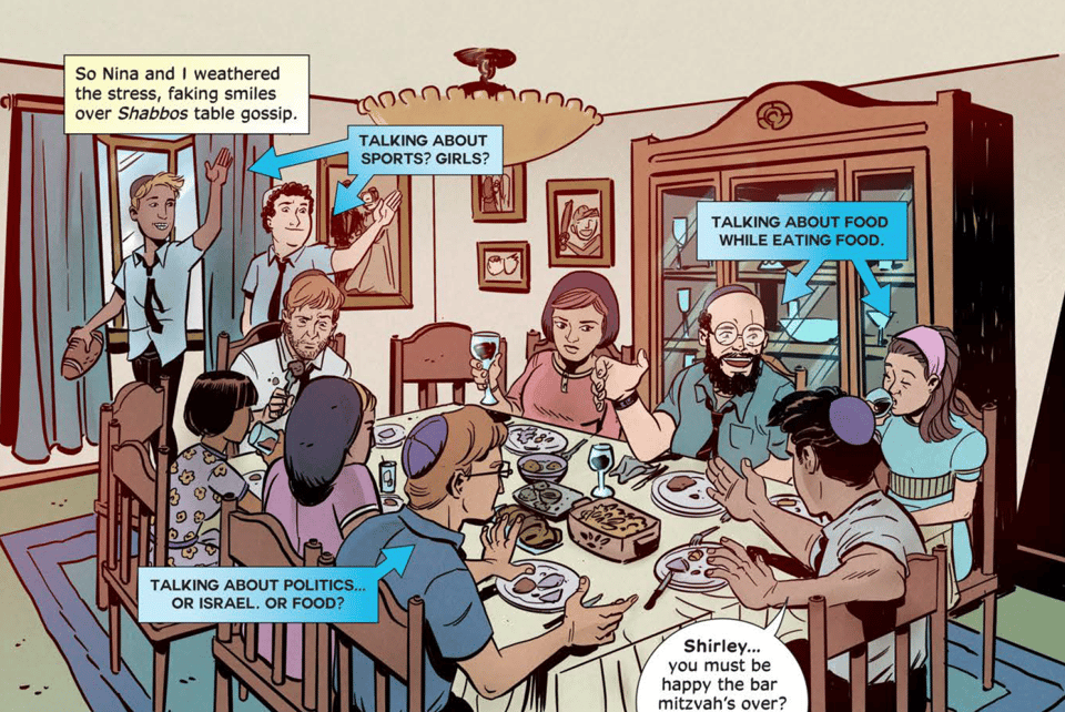Some say conversations around modern Orthodox Shabbos tables gravitate toward three topics: food, Israel, or the cost of tuition in Jewish private schools. When I started writing this comic, I wasn’t just riffing off the stereotypes about Jews and money; I was reacting to conversations I’ve had with and about people in my community—even well-off families—scraping funds together for school, camp, synagogue dues, kosher food (especially around major holidays). and religious extras integral to our chosen lifestyle. Being an Orthodox Jew ain’t for the faint of heart; sure, the laws and regulations come with willing sacrifices, but it’s an exceedingly cost-prohibitive lifestyle. Yes, sending our kids to a Jewish private school with a dual-track curriculum (Hebrew and General Studies) is a choice, and that choice comes with costs that those outside our religion may not understand and, frankly, won’t be able to muster up sympathy (again, especially when they’re having trouble paying for essentials). Some Orthodox Jews choose not to make these choices, but most do. And just because choices like paying for kosher food or religious essentials are rooted in faith, that doesn’t mean they’re not fundamental to those who make it, and being unable to pay for something in which you truly believe can cause untold anxiety, no matter who you are.