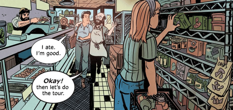 Additionally, while Chaim’s shop, “Te’Avon”, is based on an actual appetizing store in Teaneck, I want to make perfectly clear that its real-world doppelgänger is by no means housing a thriving criminal enterprise. Truthfully, Te’Avon was influenced by two different stores: Tibor’s in Cleveland, the subject of the true-crime story that inspired Nice Jewish Boys (for more about that, check out the back matter in issue 3), and the aforementioned store in Teaneck, owned by a good friend (which has both a fish and deli counter, by the way). Before my co-authors and I embarked on this adventure, I explained to that friend what I was trying to do, acquiring his blessing and permission to take photo reference for the version you see on the page. The idea was to have a location like Satriale’s in The Sopranos, where Chaim’s Avodah came to do business and enjoy a snack. I thought it would be best to add a little form to the fiction, and I want to thank my buddy and everyone else whose business, home, or synagogue you might find in the comic for allowing us to root our tale in a little reality. Again, this is a work of fiction, and the places and faces are mostly made up. I’m keeping the name of the real store out of this because I don’t want to cast a pall on my friend’s business, its staff, clients, or food, as did the true-life crimes on Tibor’s in Cleveland. Please patronize my friend’s store if you’re local and know where it is. The meat knishes and buffalo wings are equally fantastic.