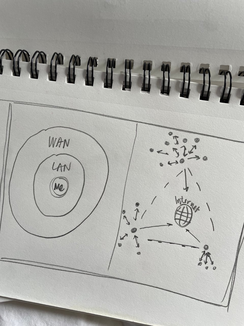 what interests me are the ways that the definitions and diagrams of LANs neatly illustrate these connections between devices absent of humans. in the relationships across our local area networks, it would appear that we neither play a part nor have a responsibility within our LANs. drawing these hard lines between humans and technology, ignore community as one of our earliest forms of technology and as essential to our networks. networks of mutual aid that provide healthcare, childcare, and financial support are examples of technologies of care within a local area network (or wide area network, also known as a WAN).
