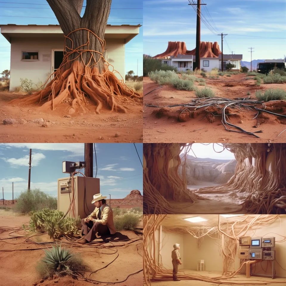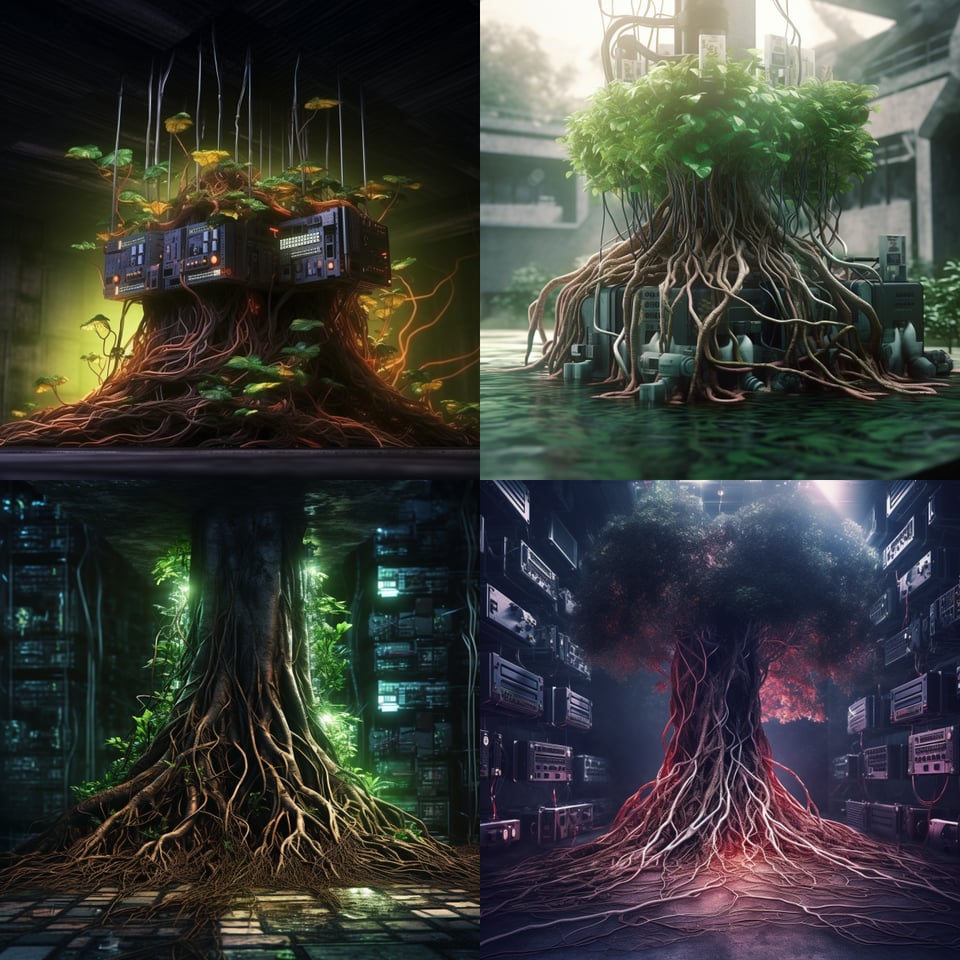 This project started as a speculative fiction short story about a plant communicating with a server in a server farm. i imagined the chemical run-off from the farm, with the whirring air conditioners that have to run constantly, had seeped into the earth. the seepage had made contact with the root system of this particular plant, making it possible to communicate with the root server. i wanted to explore this relationship between technology and nature, to not just refer to e-waste but to consider the living aspects of our ecosystem, not just humans, are part of our networks. below are a couple of early renderings i made in midjourney, to begin to visualize the main characters of this story.
