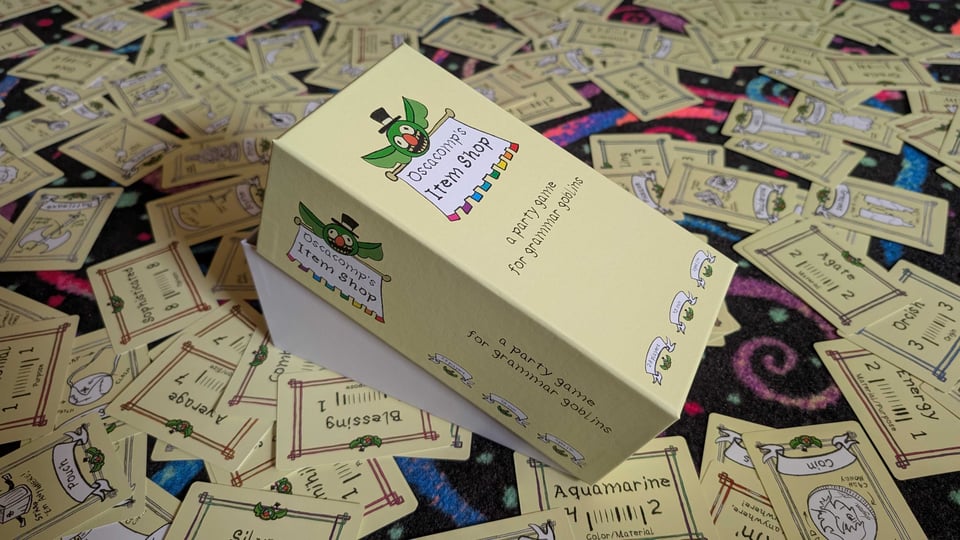 tldr: You can now buy a copy of my party game for grammar goblins, Oscacompās Item Shop, from my ko-fi shop: