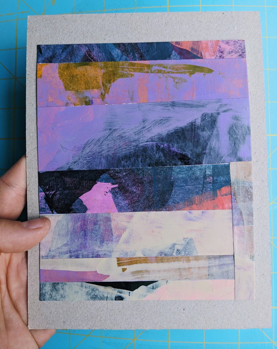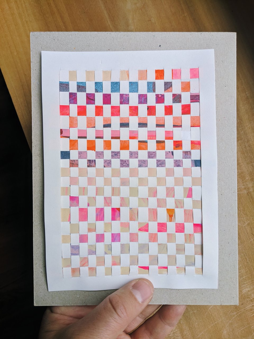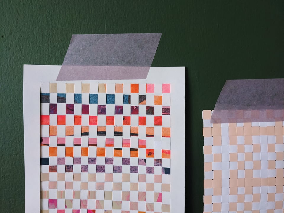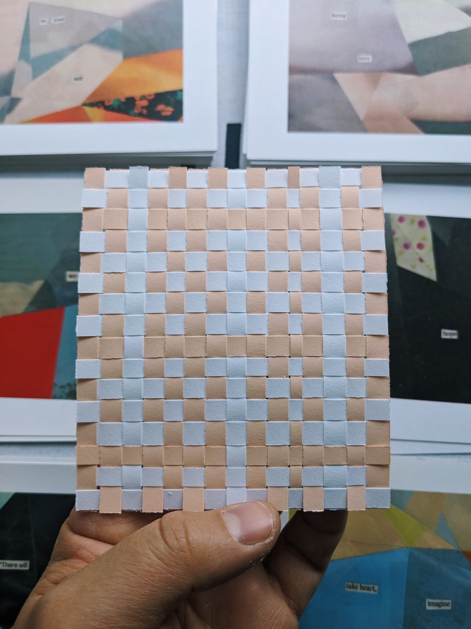 Untitled, 2025, mixed media collage, 5×9” I’ve also been learning about off-loom weaving and paper weaving. Here are a two test pieces I made recently.