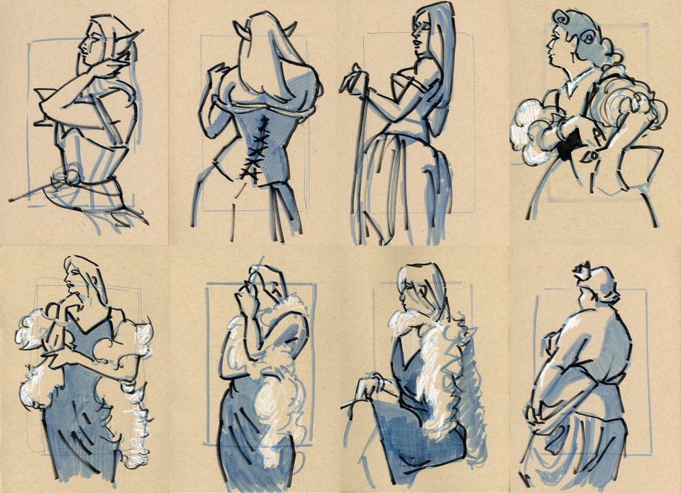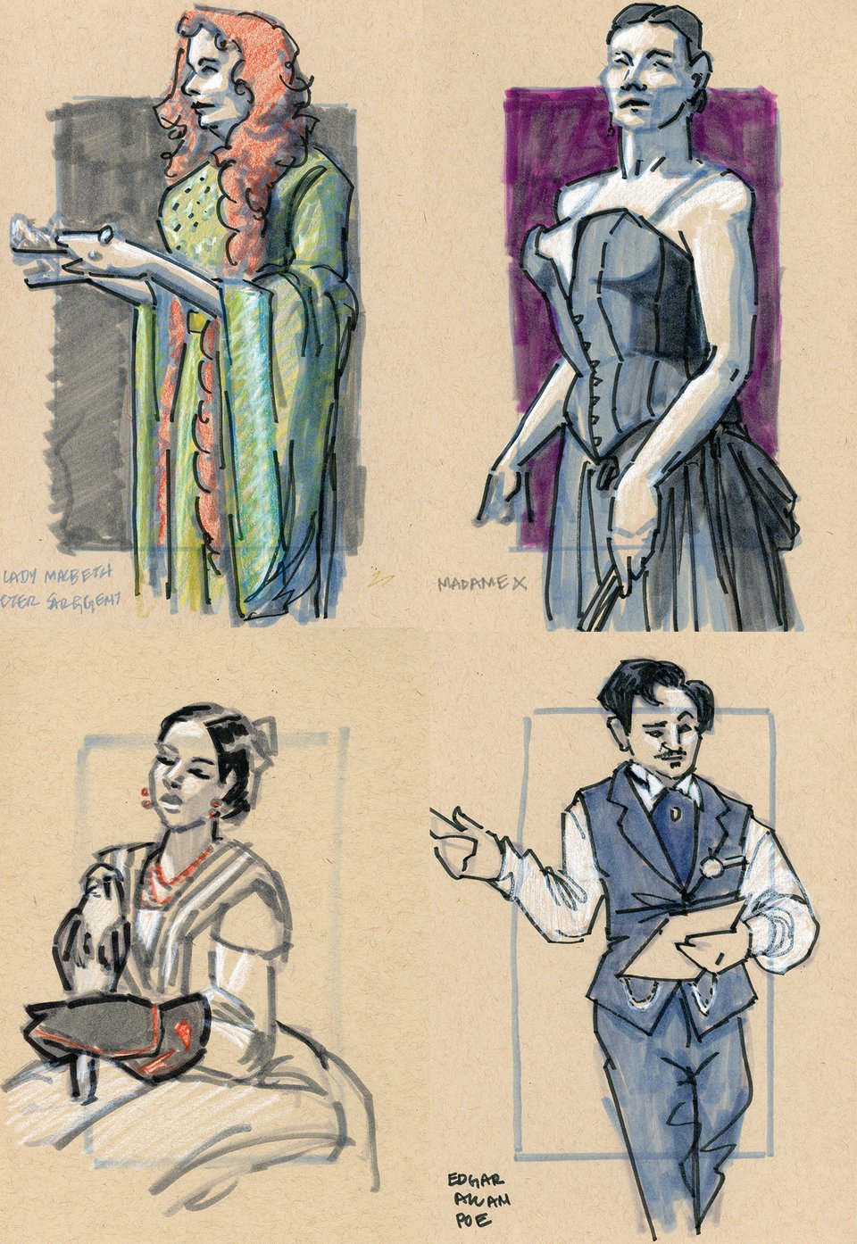 On the first weekend, we got to draw the models with live birds, and on the second we did an homage to Sargent's Lady Macbeth and Madame X, from live models. I also snuck in a sketch of Edgar Allan Poe while he was reading!