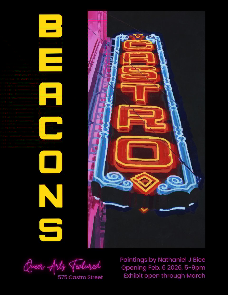 BEACONS will be opening February 6 in conjunction with the Castro Art Walk, and is also timed with the re-opening of the Castro Theater. Both Queer Arts Featured and I are grappling with and holding space for mixed feelings around the restoration/renovation of the theater and Another Planet Entertainment’s choices and management. I’m delighted to see the neon sign working and for the theater to be a center for community and culture again, and I can’t wait to see all the interior details cleaned up and restored.