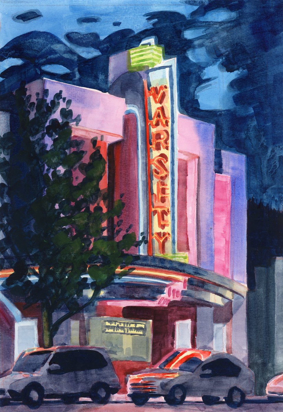 I just returned from a trip to the Oregon Shakespeare Festival in Ashland! I’ve been there pre-season for work before, but this was my first opportunity to be a regular audience member and just enjoy it as a vacation. Of course, that didn’t mean I was going to avoid painting! I took advantage of the warm weather on the first night and did a nocturne of the Varsity movie theater in watercolor, trying to get that value contrast with bright, saturated neon colors.