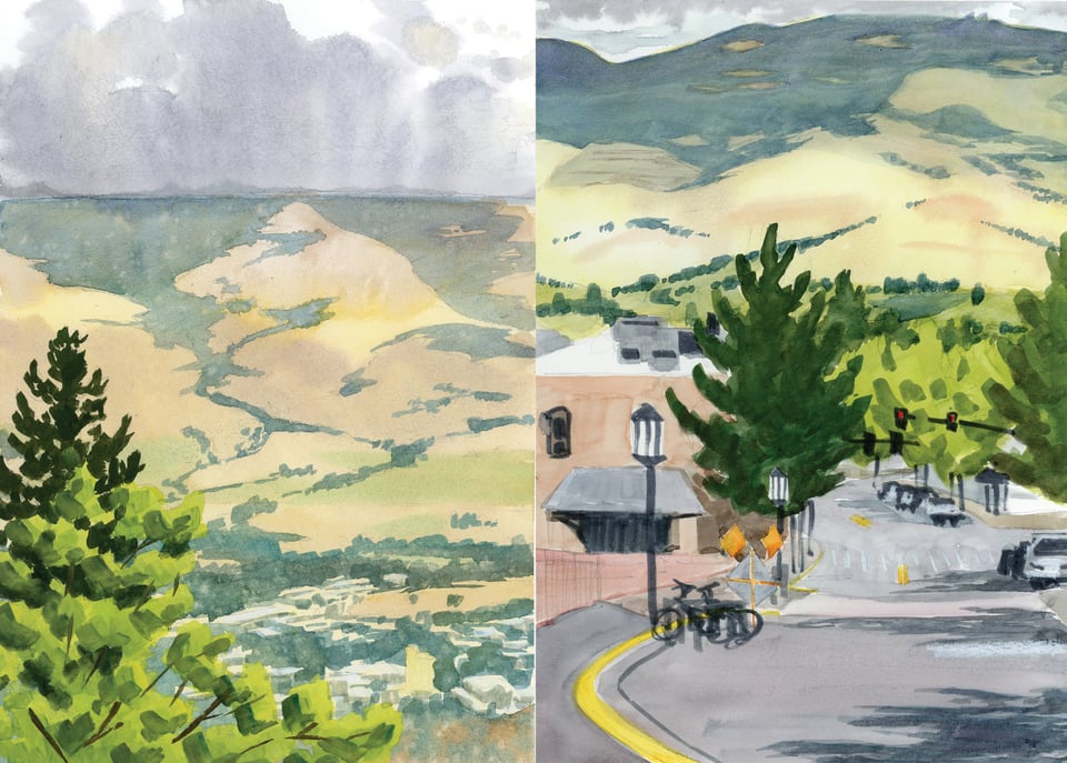My other two pieces both focused on the hills outside of Ashland, which I think are so beautiful. For the first, I hiked up over Ashland and got the big view, the second is from just outside the theater looking into town. I only got a little bit rained on while finishing these two up.