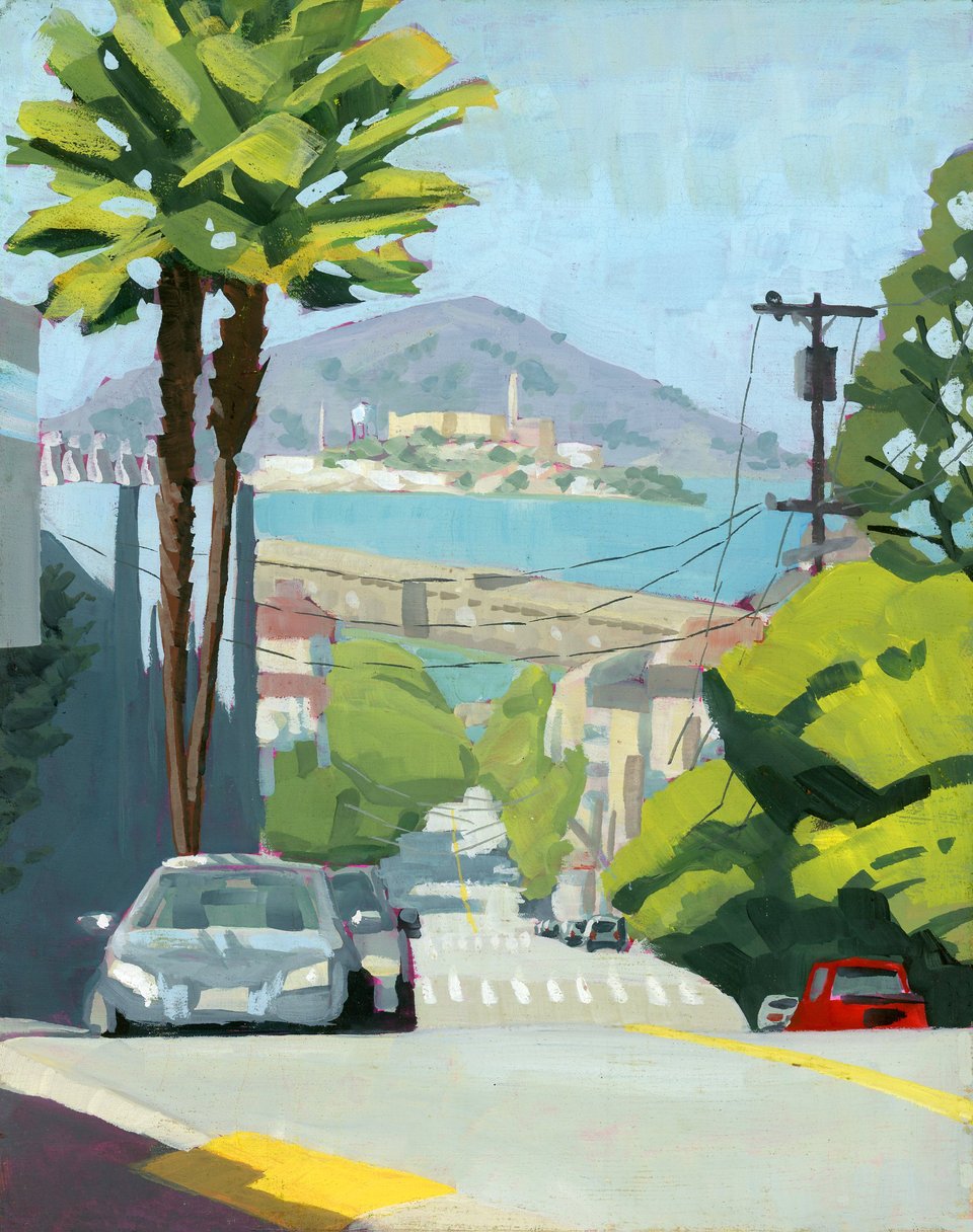 Before I left San Francisco, My painting friend Mila Kirillova and I recently went painting in Russian hill, along Leavenworth. I looked down the street towards Alcatraz, and Mila looked the other way up the hill past the tall retaining wall. I’ve been working on including more context and foreground in my compositions, and I loved making it all the way down to the sidewalk and the shadow.