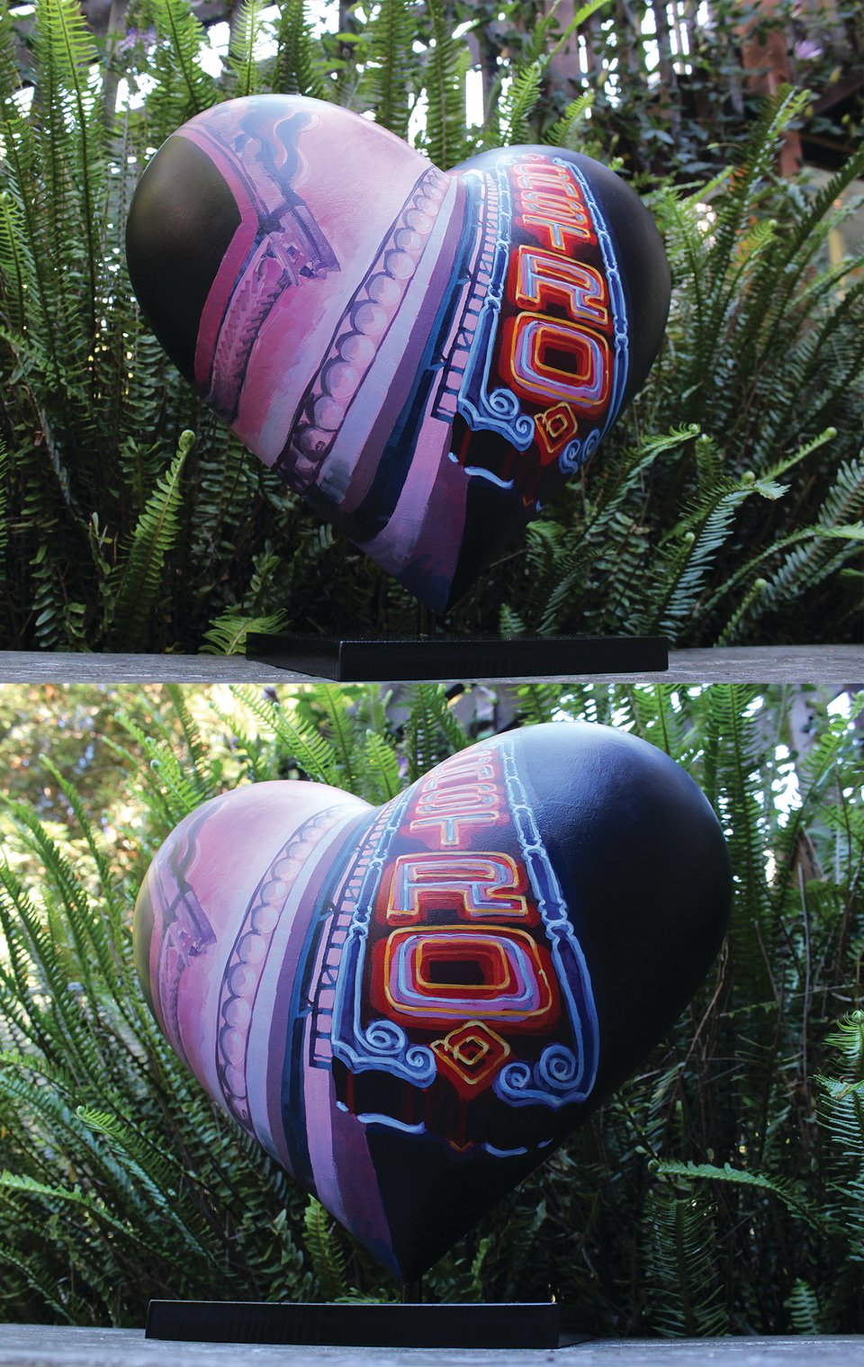 This year, I was selected by the San Francisco General Hospital to paint one of their heart sculptures for their annual fundraiser! You have most likely seen the giant heart sculptures all over San Francisco. This is a smaller version of the same thing, about 15 inches across. My heart design is also in the neon theme! It depicts the Castro blade sign fully lit up and restored, from both sides. Figuring out how to wrap the design around the heart was an interesting challenge, because the perspective means that the sign gets larger as it gets closer to the bottom, while the physical object I’m painting on gets smaller. I also wanted both sides to connect to each other smoothly.