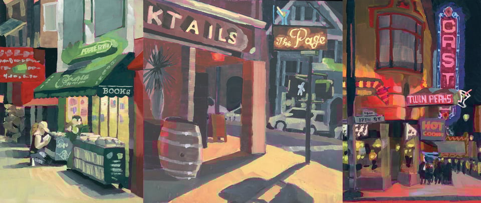 BEACONS will be mostly large, acrylic paintings of my favorite neon signs around the city. However, I want to ground that work in direct observation and plein air painting. I’ve been taking advantage of the warm weather and the time change to go out and paint nocturnes! I keep preparing for a freezing San Francisco evening and then leaving my jacket hanging off my easel instead. I think direct observation is so important with neon in particular, because the color and light look so different in person than in my photo references. Taking the time to study them from life means I can bring that experience to the larger paintings.