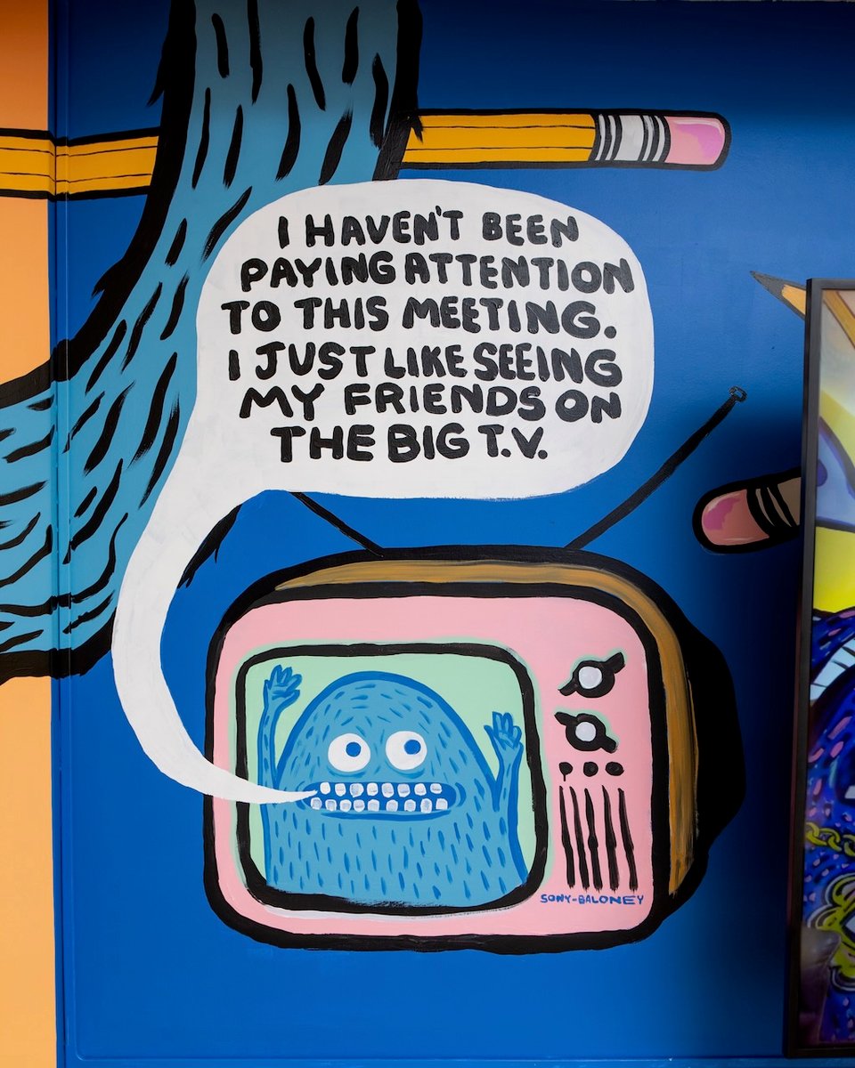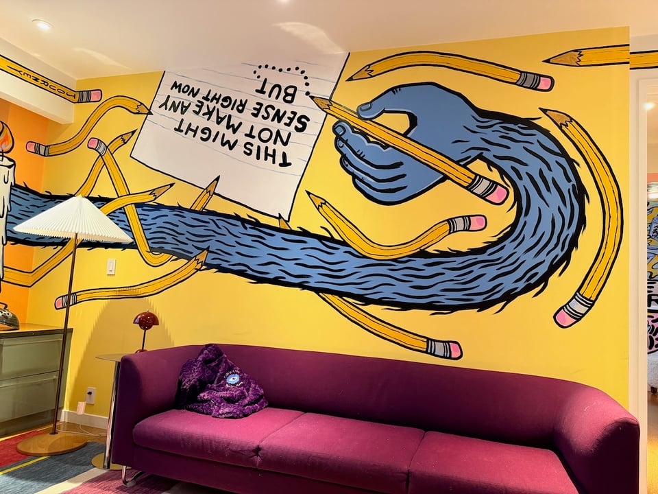 That guy turned out to be Dave Zackin, whose work has gone viral several times for its relatable wit. Dave takes rejected pieces from others in his ceramic studio and carves, glazes, and sculpts characters, statements, and illustrations onto them. I quickly adjusted my plans for the week, and ended up spending as much time as possible helping him with the mural. It consisted of not just one wall, but two full rooms, a closet, and the sides of a staircase, all improvised by Dave.