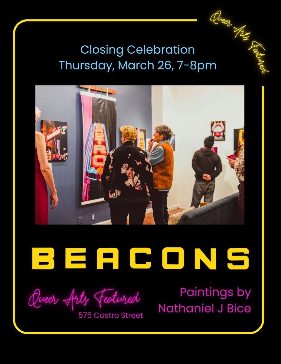 For those just joining us, BEACONS is a series of paintings of San Francisco’s neon signs, celebrating queer spaces. It’s up at Queer Arts Featured through March 29. I spent the three months before the exhibit opened in February in a concentrated painting spree, working indoors and/or on nocturnes. I am so proud of this as my first solo exhibition. Celebrate one last time with us on Thursday, March 26, from 7-8pm!