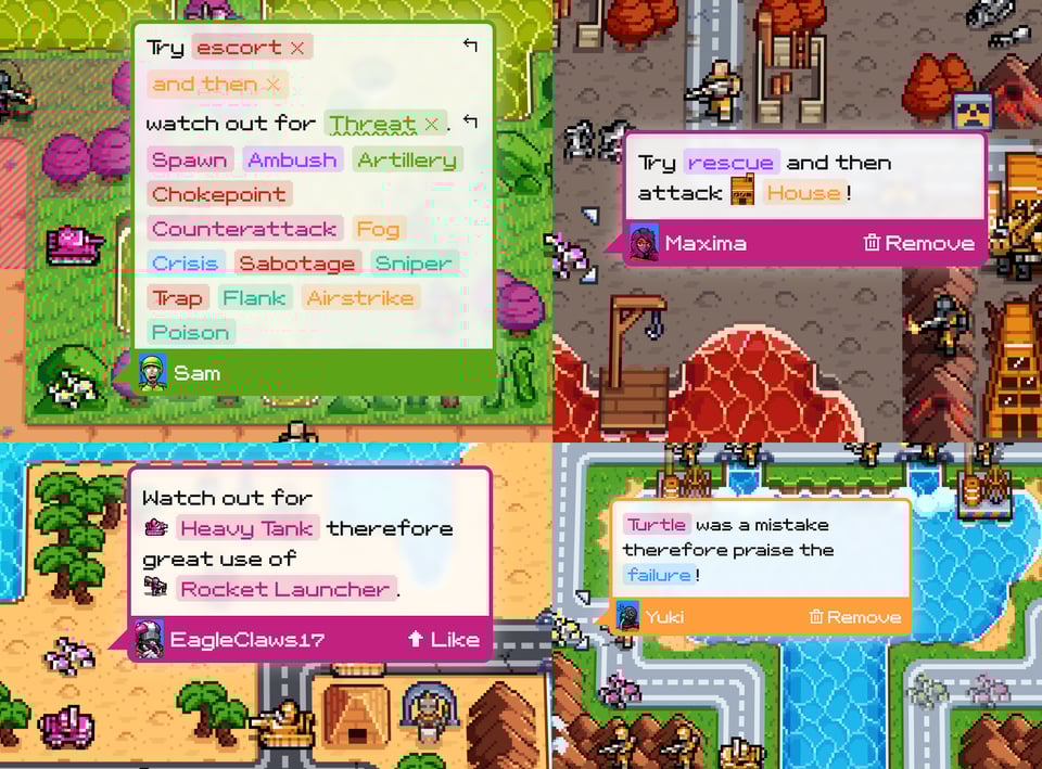 Athena Crisis now has an elegant real-time messaging system built from templates, tags, and conjunctions. Players can communicate during a game, and help others with hints even across maps and campaigns. Popular messages will show up across the multiverse to guide (or hinder) players. Messages that are liked often glow in gold, and the author receives a Chaos Star which they can use in the shop to buy unlocks.