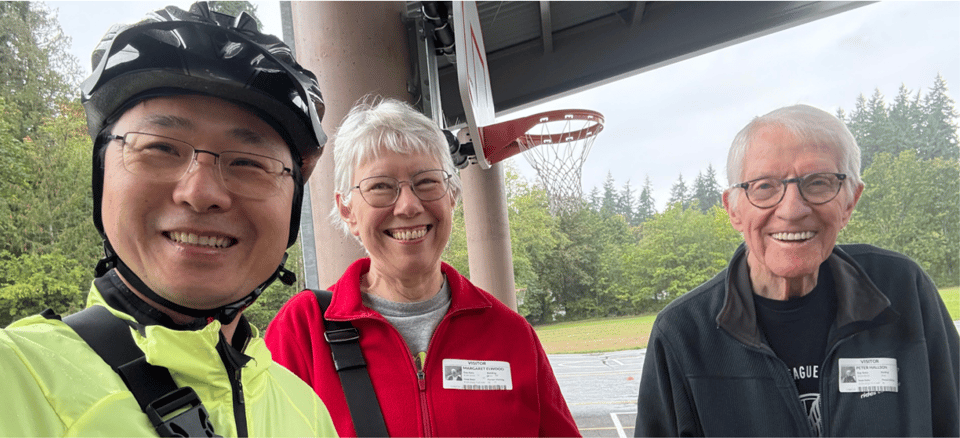 On September 30, Edmonds Council Member Will Chen joined NSBA Board Members Peter Hallson and Margaret Elwood to observe a “Let’s Go” physical education class with third graders at Brier Elementary. Teacher Jody Wallis exhibited his passion for teaching signaling, checking for traffic, safely riding and stopping, and of course wearing a helmet, as he led about 30 students through practice drills along painted lines and traffic cones in the covered outdoor PE area. Despite the rain, almost all of the students chose the optional circuit around the paved path around the field during the 30 minute class.