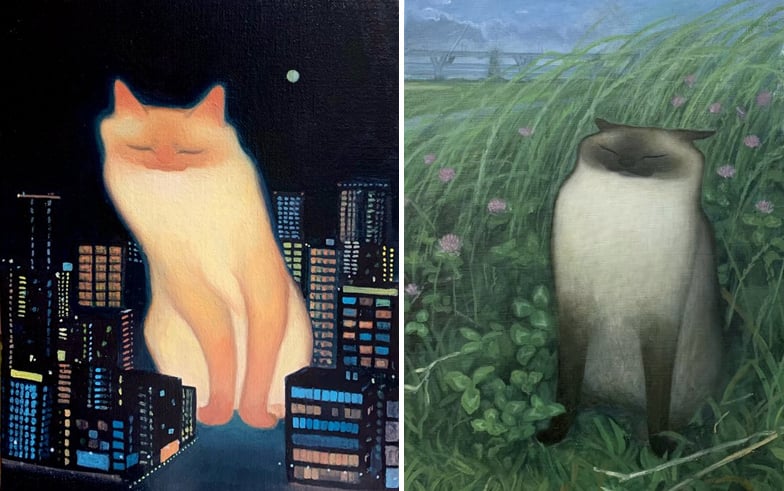 I’m not sure if Karin is painting with oil on canvas, but this is just absolutely adorable. I love how she uses some pastel or at least washed out tones. It gives such a sense of peace and reminds me of one of my favorite animations, Diary of Tortov Roddle – a surrealist short film by Kunio Kato. Lots of references to Magritte and Salvador Dali.