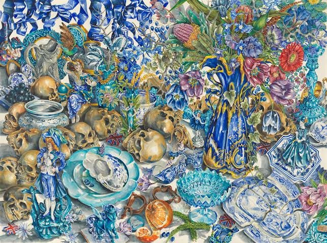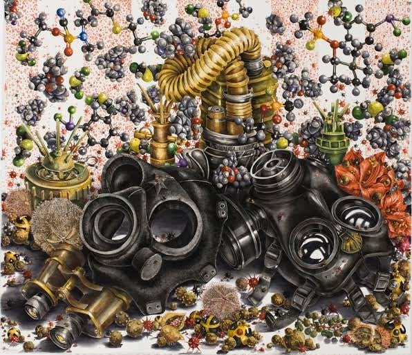 MJW: eX de Medici is an Australian artist who I had not heard of until I saw a snippet about her work in a show at the Australian National Gallery. Her work is bold and hectic and political, done in the traditionally soft medium of watercolours.