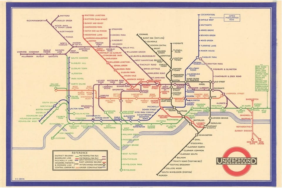 Eine in von Information-Design-Nerds gern erzählte Geschichte ist der Londoner U-Bahn-Pläne. Bis 1933 waren sie geographisch akkurate Replikationen der messbaren Welt.