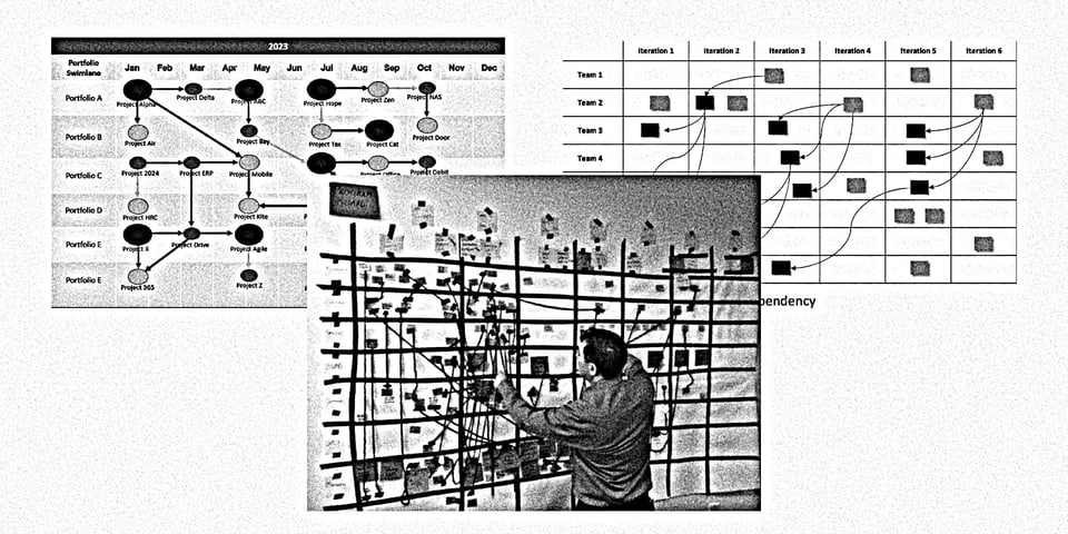 Dazu benutzt man dann Team-übergreifende Planungen, malt Abhängigkeitsbäume, zieht rote Fäden zwischen Abhängigkeiten und dergleichen mehr. Das geht auf Ebene von Teams, einzelner Features oder auch kleinteiliger Arbeitspakete, und hat immer einen zeitlichen Bezug, der aussagen soll: Team X, ab Zeitpunkt Y ist das, was ihr braucht, da.