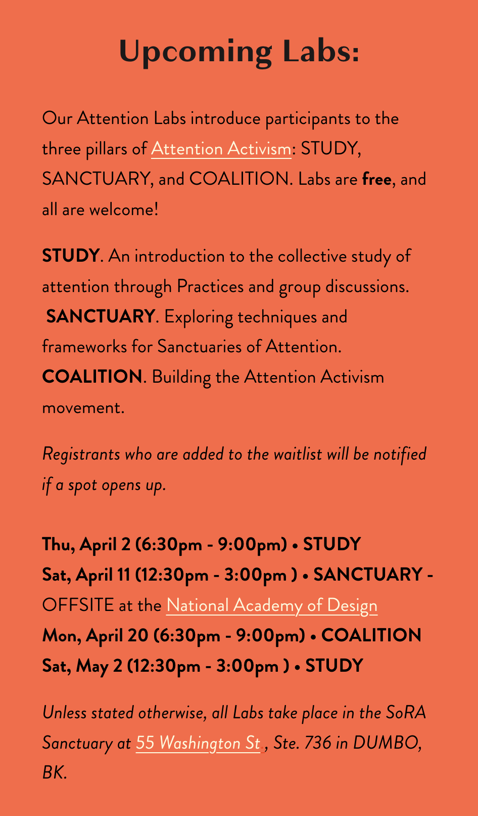 11 ★ 11am Quiet Subway ★ 12:30pm Attention Lab at NoAD ★ 3:30pm Attention Activism 101 IN-PERSON ★ 5pm SoL Event Workshop |
