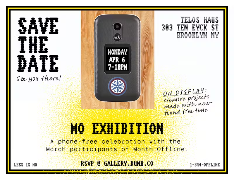 Phone-free gallery exhibition to celebrate the second NYC cohort of Month Offline going 30 days with a dumbphone. Want to hear what it was like? Join the celebration.