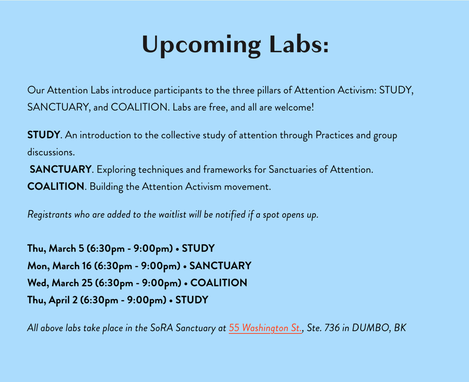 Thu., Mar. 5 | Attention Lab "STUDY" @ 6:30 p.m., DUMBO
