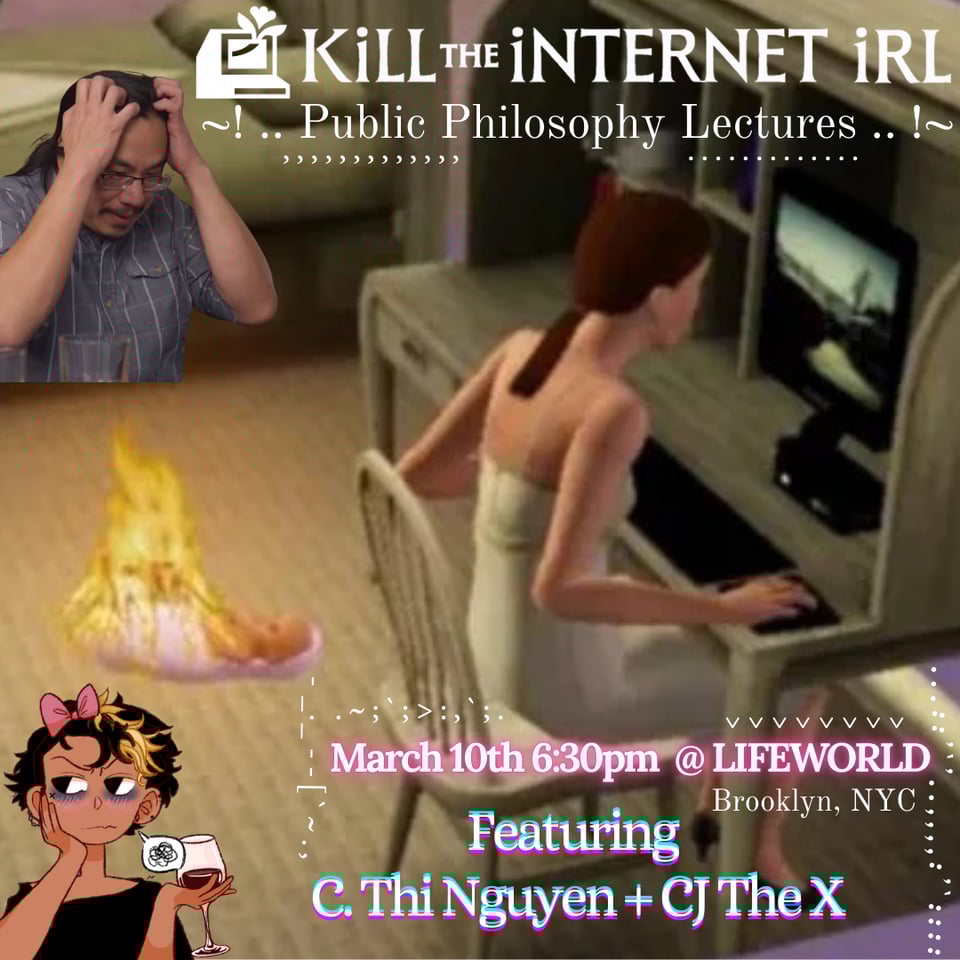 Internet philosopher CJ The X and actual philosopher C. Thi Nguyen give joint lectures on the internet and its dissidents, wielding memes, words, images, ideas, books, jokes and history to reveal our Digital Hellscape Circus World for what it IS and for what it COULD be.