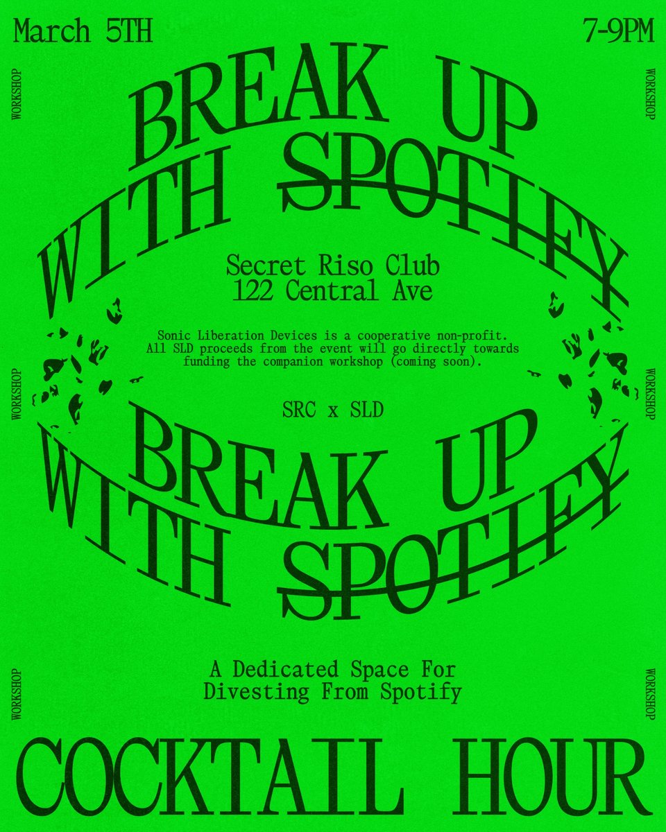 Join us for a cocktail hour and workshop by Sonic Liberation Devices Thursday March 5th from 7–9 at Secret Riso Club. This workshop intends to create a dedicated space for divesting from Spotify by migrating to another framework, ranging from other popular apps to hosting your own home media server. We aim to critique Spotify executives' investments and the existence of the streaming model while rekindling a physical space for talking about and sharing music.