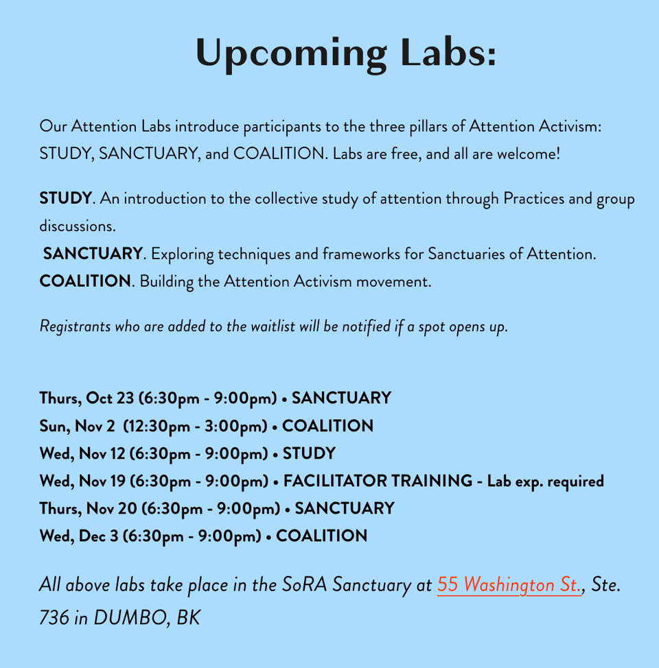 This lab’s focus is COALITION: to work together to liberate our attention across our communities.