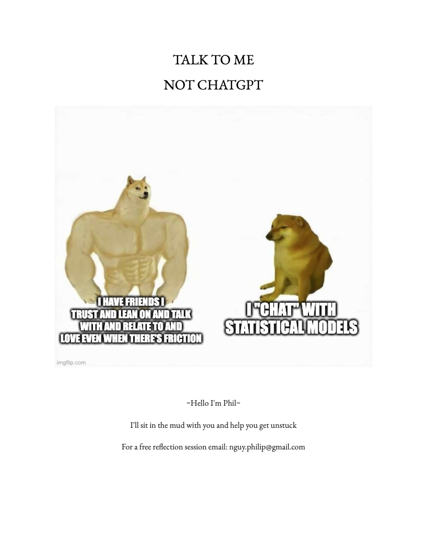Why not “chat” with a LLM or read more self-help books instead? My tentative answer is this: shared presence and conversation with another human offers the possibility of deeper nourishment. I haven’t quite figured out how to articulate why this is the case, but it has something to do with the joint exploration, the courage it takes to open up to someone who may challenge you while supporting you within the challenge. Only people can offer this to one another.