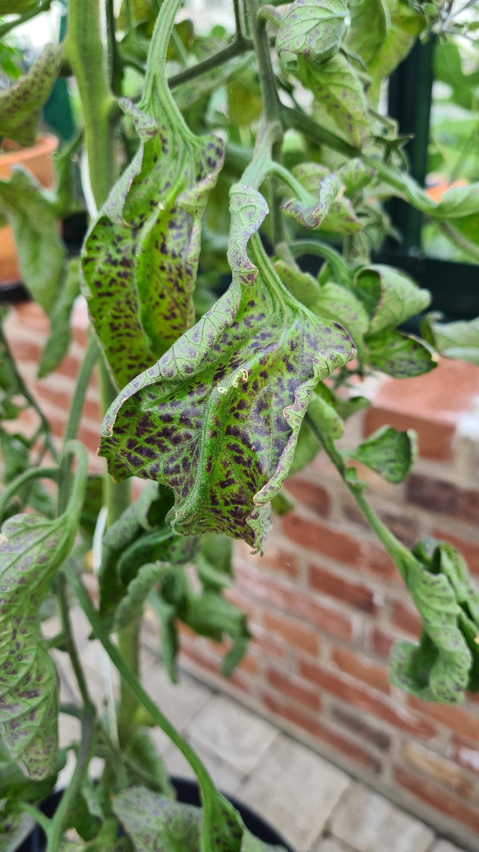 Varför skrynklar och fläckar sig bladen på Karins tomatplantor?