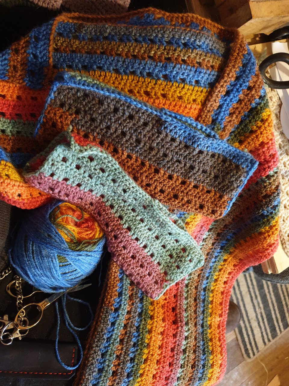 I like to call it the rainbow trout. Scraf and fingerless gloves. And now useing the last bit to make a matching book cover.