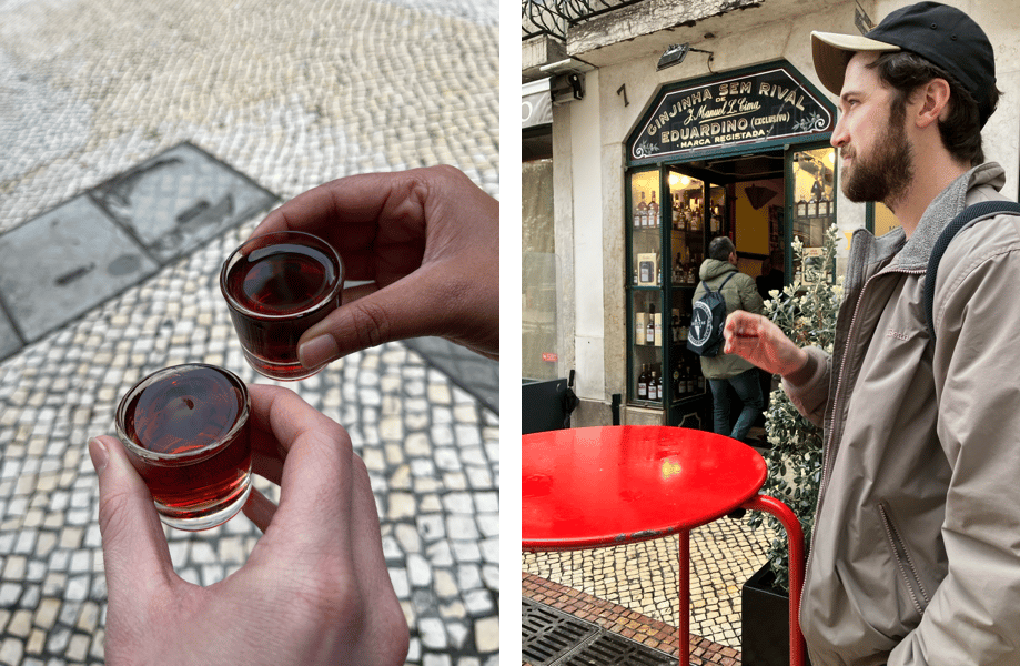 After a long day of walking, it started drizzling, and we ducked into a little hole in the wall. It turned out to be Ginjinha Sem Rival, a landmark 1930s bar selling local cherry liqueur. We were handed two little cups of Ginjinha, which we sipped happily in the rain before running back home.