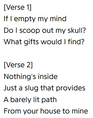 I have been mulling over the double (or triple) meaning of the second verse. Disregarding some of the self-deprecation of the song, the slug is an exciting conjunction point! When I first listened to it (from what I thought was from the perspective of a robot) I thought of the URL slug. You know that funny tail of a URL that brings you to a specific landing page.