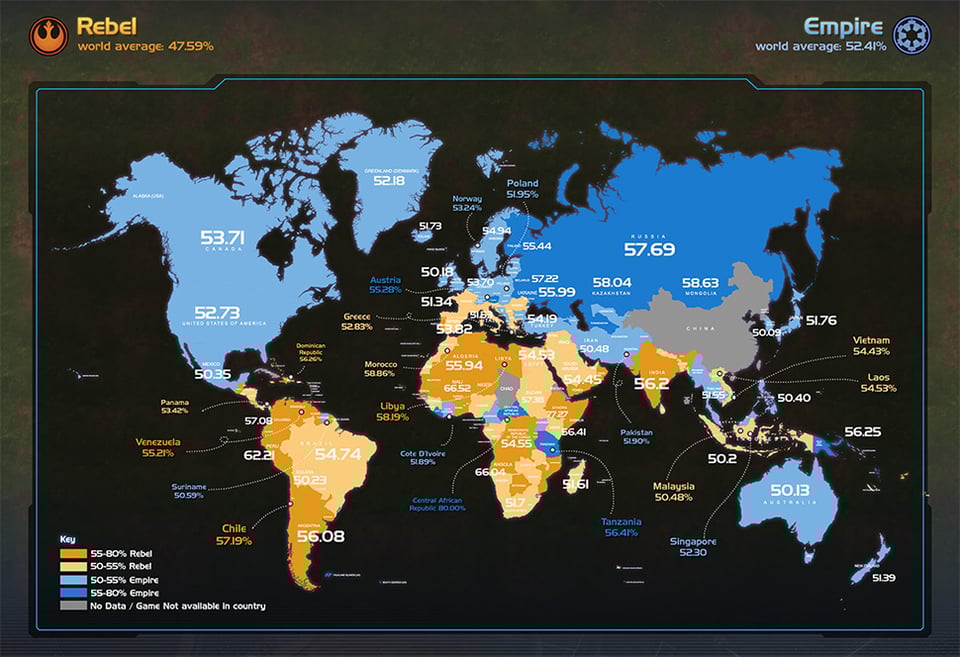 I think a lot about this graphic, which shows that in one Star Wars video game, a majority of players in the developed northern hemisphere chose to play as the Empire while players in the southern hemisphere chose to play as the Rebel Alliance: