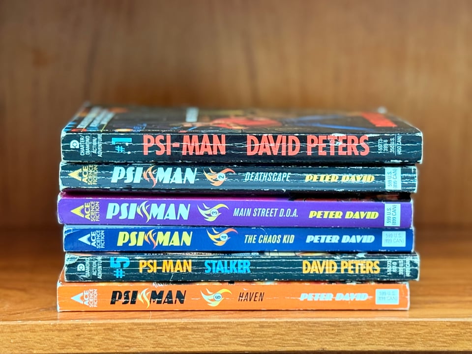 When I heard about David’s death, I tracked down six of his books online—a serialized collection of paperbacks under the series title “Psi-Man,” which were originally published under the pen name “David Peters” but were eventually republished under his real name. They’re a sci-fi twist on the men’s adventure serials of the 1970s and 80s, about a pacifist named Chuck Simon who has psychic powers. Simon (Psi-Man, get it?) must go on the run to evade the shadowy government and criminal forces that want to harness his powers for evil, and he is aided by a sardonic telepathic German Shepherd who served as both the comic relief and the muscle.