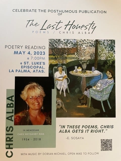A public reading of poems from The Last Honesty by the late Chris Weygandt Alba will take place on May 4 at 7 p.m. at St. Luke’s Episcopal Church at 5318 Palma Avenue in Atascadero. Open mike will follow.