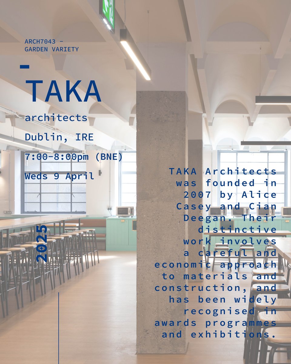 TAKA Architects was founded in 2007 by Alice Casey and Cian Deegan. Their distinctive work involves a careful and economical approach to materials and construction and has been widely recognised in awards programmes and exhibitions.
