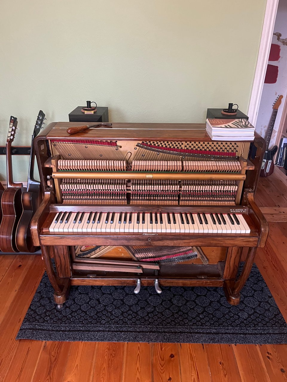 I’ve recently been donated a rather charming 1940s cottage piano — a smaller-scale acoustic (about six and a half octaves) — and I’ve set myself the project of getting it tuned, cleaned, and having one string repaired.