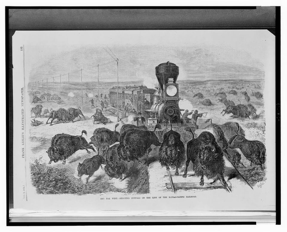 The railroads themselves saw bison as an impediment. The animals interfered with their expansion plans, slowing construction or crossing tracks in front of locomotives. Hunters killed bison for all manner of reasons: to feed railroad workers, to chase the animal from construction areas, or, pathetically, for entertainment from their railcars. Harpers Weekly described a typical unsporting scene: