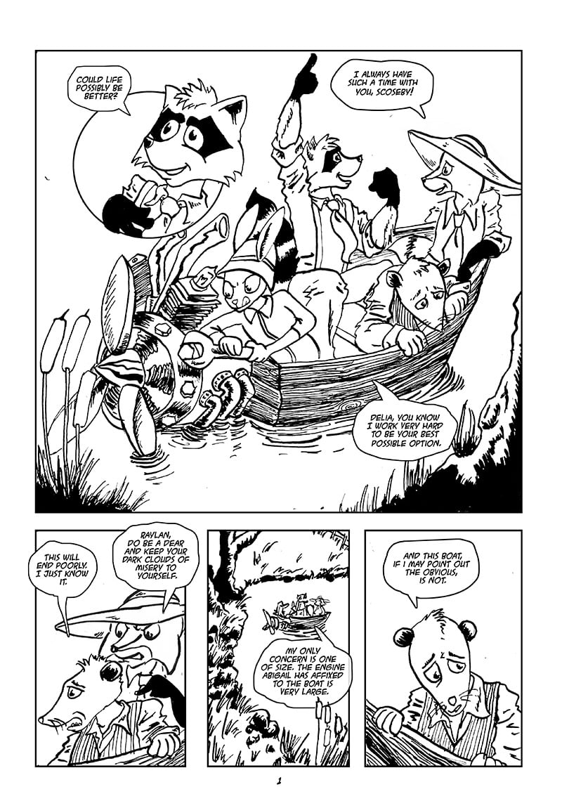 Scoesby Cuts a Rug is about a well-to-do raccoon named Scoesby who can’t quite get his life together. In tone, it sits somewhere between Walt Kelly and P.G. Wodehouse, as Scoesby is beset upon by the often conflicting demands of friends and family in the midst of idyllic Southern environs, trying to figure out what he wants and why he isn’t satisfied just being himself.