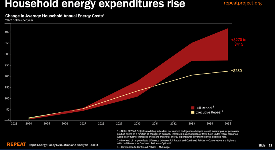 Perhaps the un-delivering of IRA benefits, in the form of rising household energy bills, will backfire for Trump and Republicans? The REPEAT Project’s “Fork in the Road” report found average annual US household energy costs will be $100 - $160 higher under the repeals contained in the House H.R.1 budget bill: