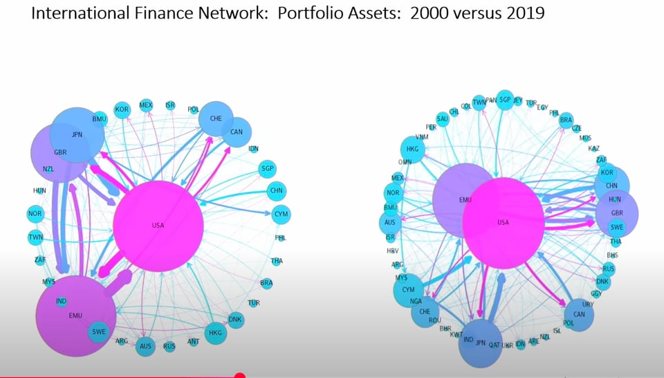Her presentation included these infographics showing how international merchandise trade has changed since 2000 from a US-hub structure to a US-Euro-China hub.
