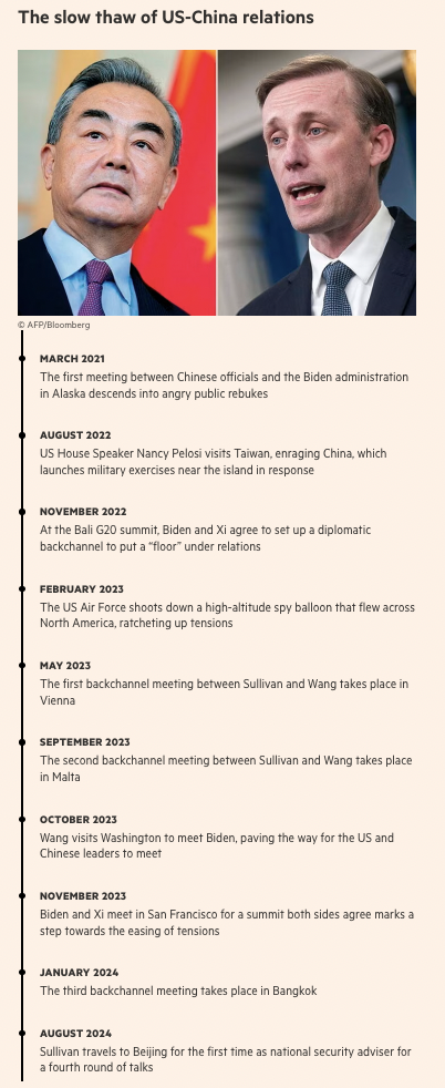 Last week, Xi Jinping held a surprise meeting with Jake Sullivan in Beijing. Sullivan, Biden’s national security advisor, has been viewed as the most powerful NSA since Kissinger, and was in Beijing to meet his counterpart Wang Yi. The two have been meeting each other in a “secret back channel” (per the FT) in the neutral zones of this spiralling second cold war — a meeting in Vienna on May 2023, Malta in September 2023, Bangkok in January 2024, and now in Beijing. The goal is for the two superpowers to communicate, preview decisions, and avoid a paranoid miscalculation that could threaten the life and wellbeing of all denizens of our fragile blue green planet.