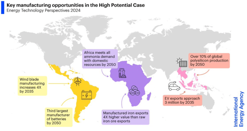 The somewhat neoliberal IEA has decided to stop fighting with countries about whether they should do industrial policy and has instead created a detailed global model to help them with planning – identifying sectors where they can develop some comparative advantage given existing knowhow and resources (wind in Latin America, EVs in North Africa, solar in Southeast Asia, etc.). In its model, clean sectors will be tripling in investment and export value by 2035 to over $2 trillion. That’s a lot of green pie to fight over. And as the Polycrisis has been arguing for a while now, developing countries do not want to turn into peasants of the new re-concentrated green world order in which the existing green winners – China, the US, and EU – dominate.