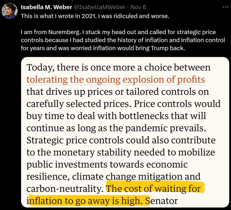 But the Democrats lost Congress in the 2022 midterm elections. So, no legislative or fiscal fixes could be offered there – meaning that the only policy to dampen inflation was the blunt hammer of the Fed hiking interest rates. A majority of people felt those higher interest rates immediately – car lease payments and consumer credit card payments shot up, and the disposable income of tens of millions was affected, as Larry Summers and co pointed out in their 2024 paper The Cost of Money is Part of the Cost of Living.